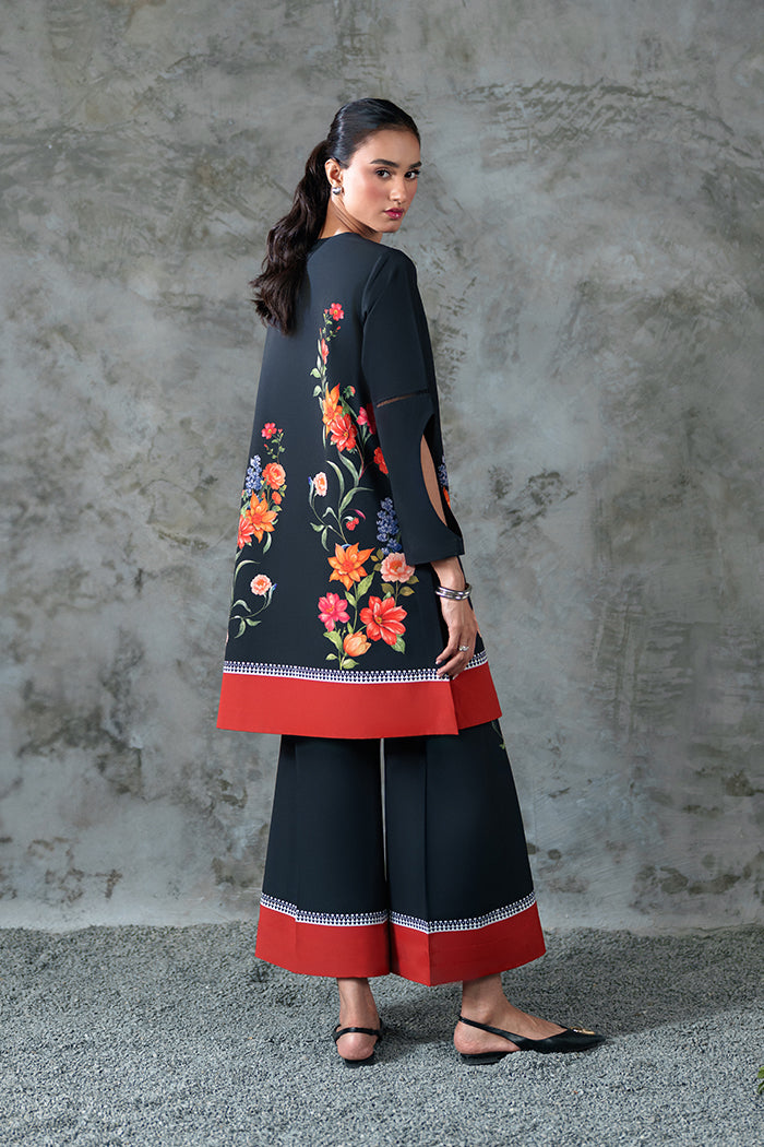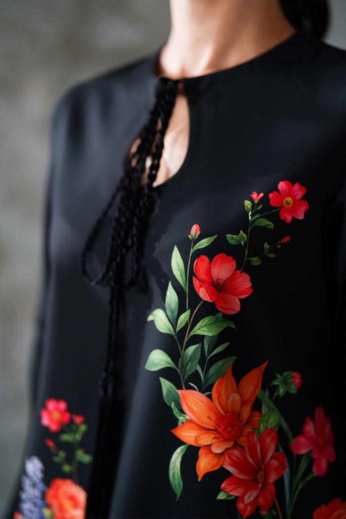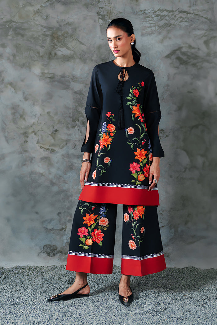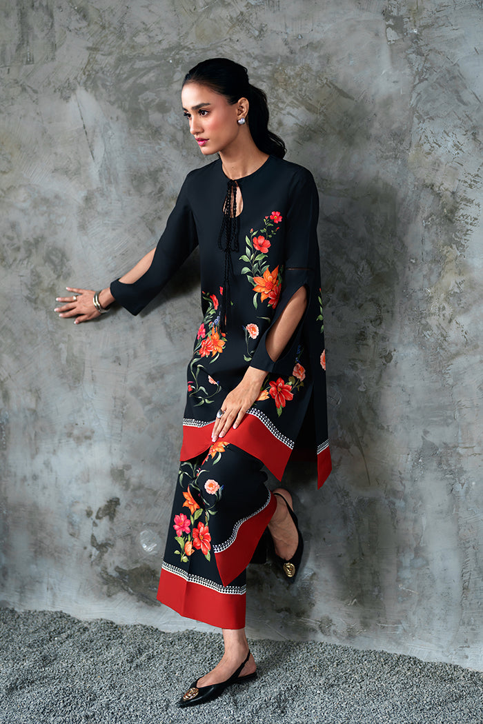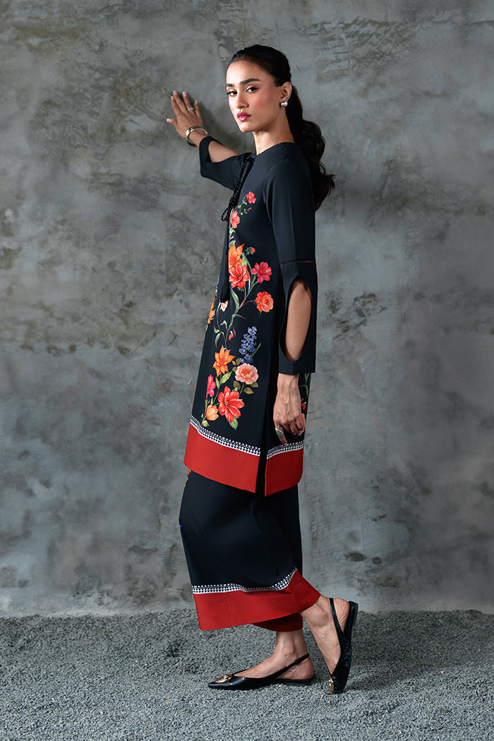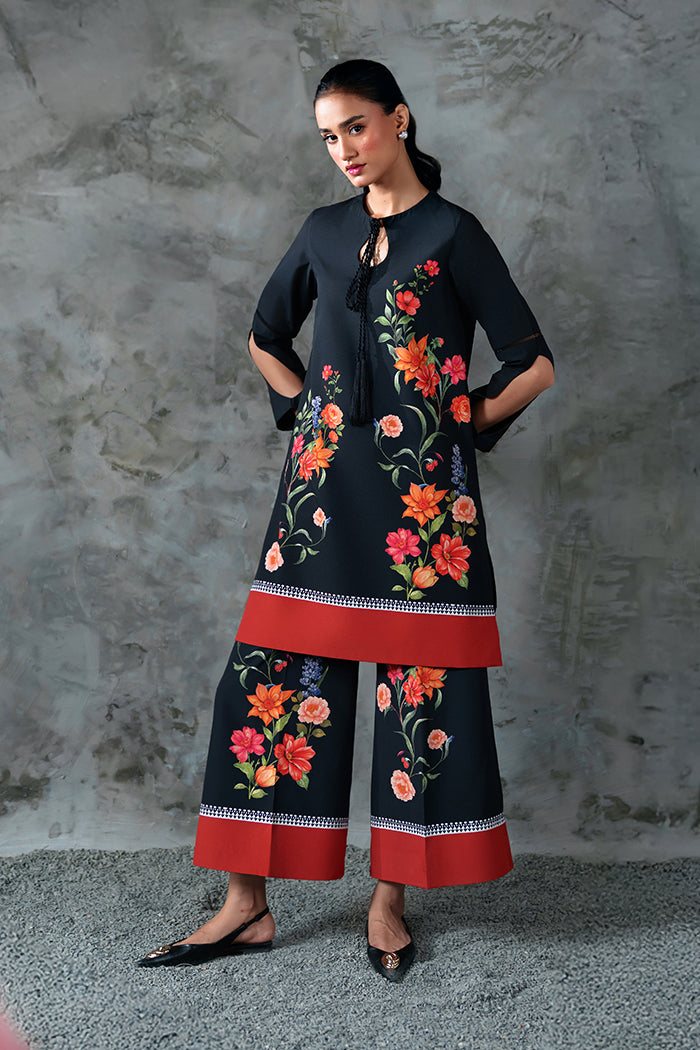 Made from premium crepe , this black floral co-ord set blends sophistication with bold artistry. The long top features a sleek neckline with subtle detailing, paired with beautifully placed vibrant florals that add depth and charm. The wide-leg trousers echo the same floral motifs with striking red borders, creating a perfectly balanced and modern silhouette. Soft, glossy, and effortlessly graceful, this outfit is ideal for refined daytime looks or chic evening wear.