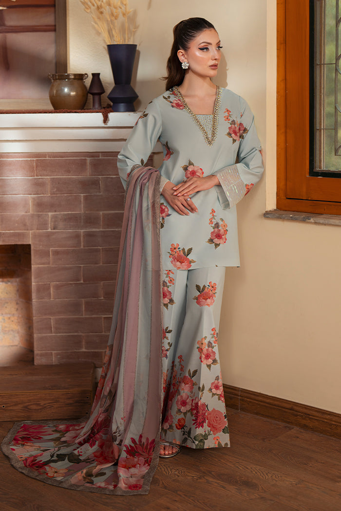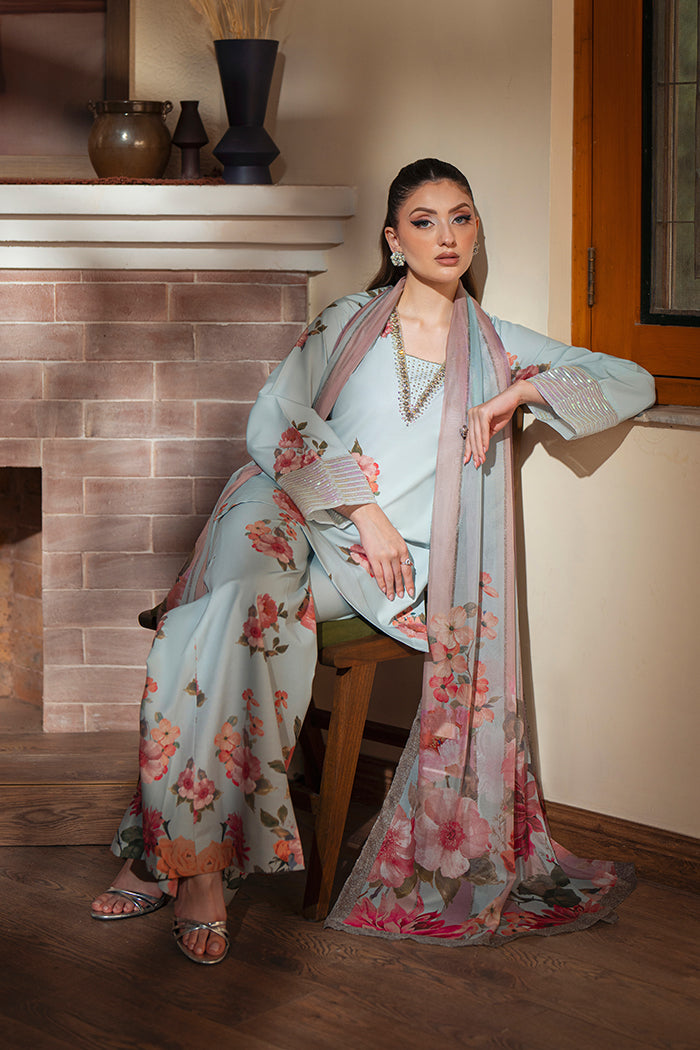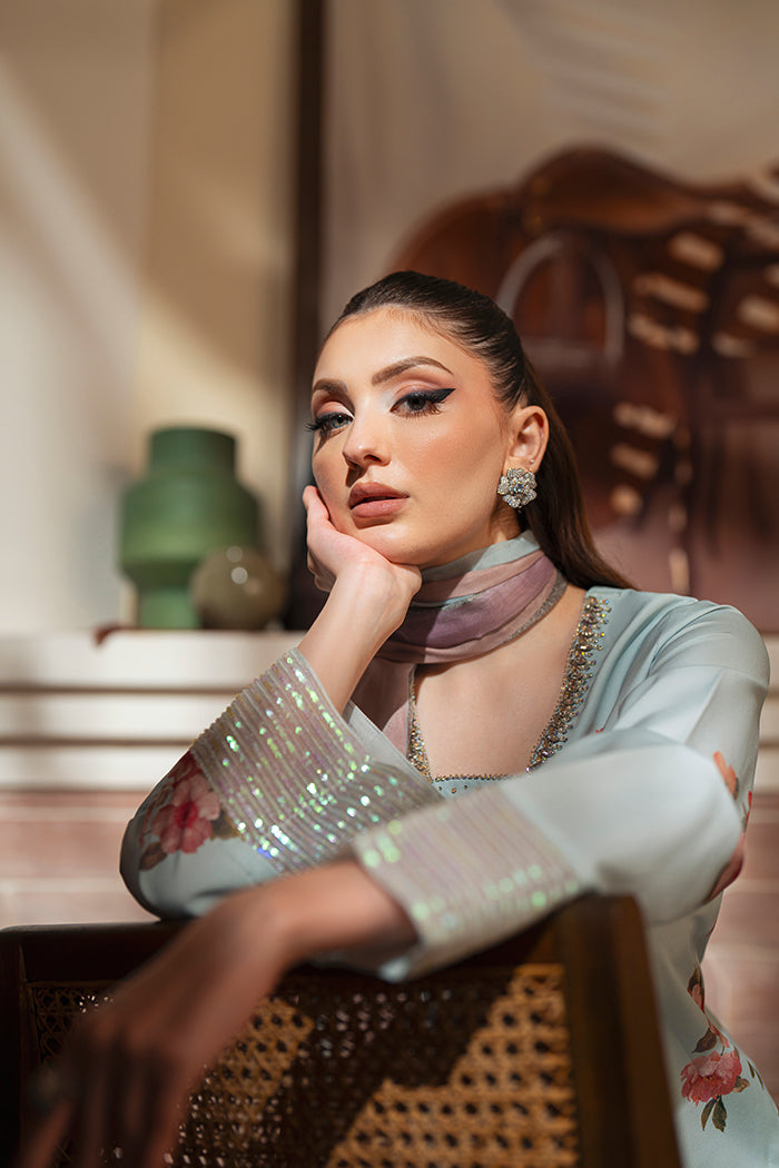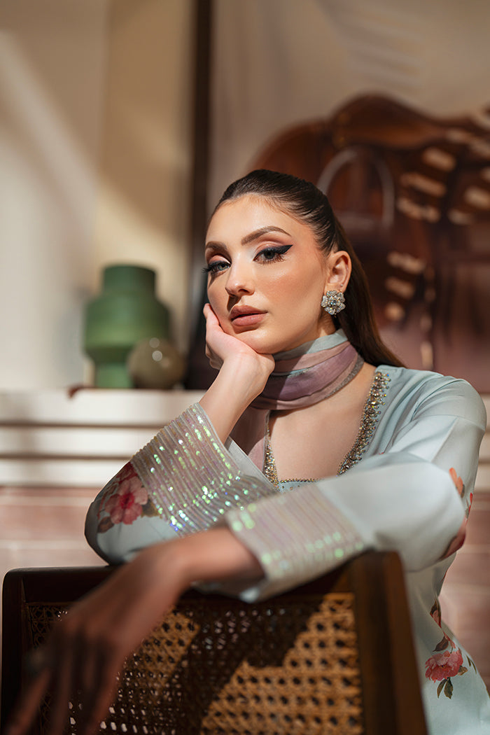 An elegant crepe outfit adorned with delicate hand embellishment on the neckline and a sequin border on the sleeves. Paired with wide-leg crepe trousers and a flowy silk dupatta featuring floral prints, this ensemble blends timeless grace with modern sophistication.