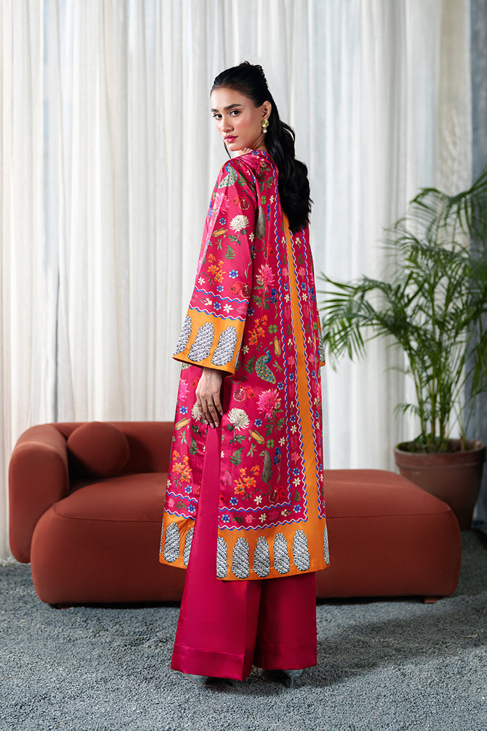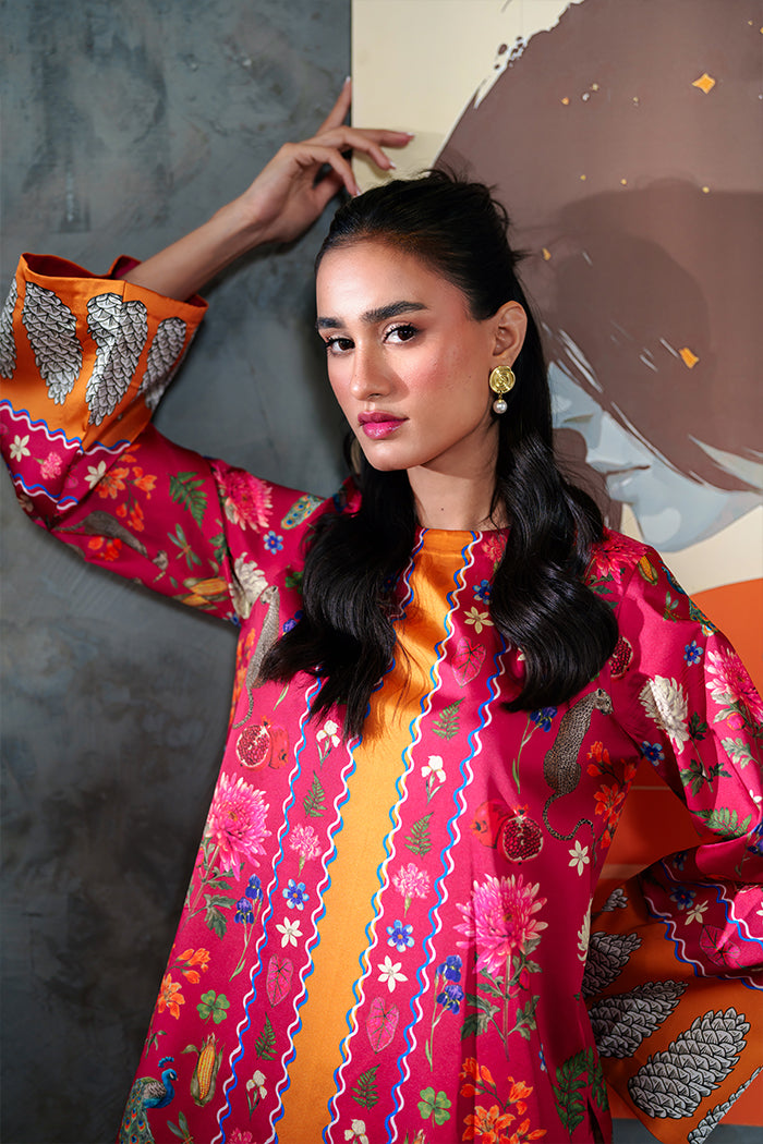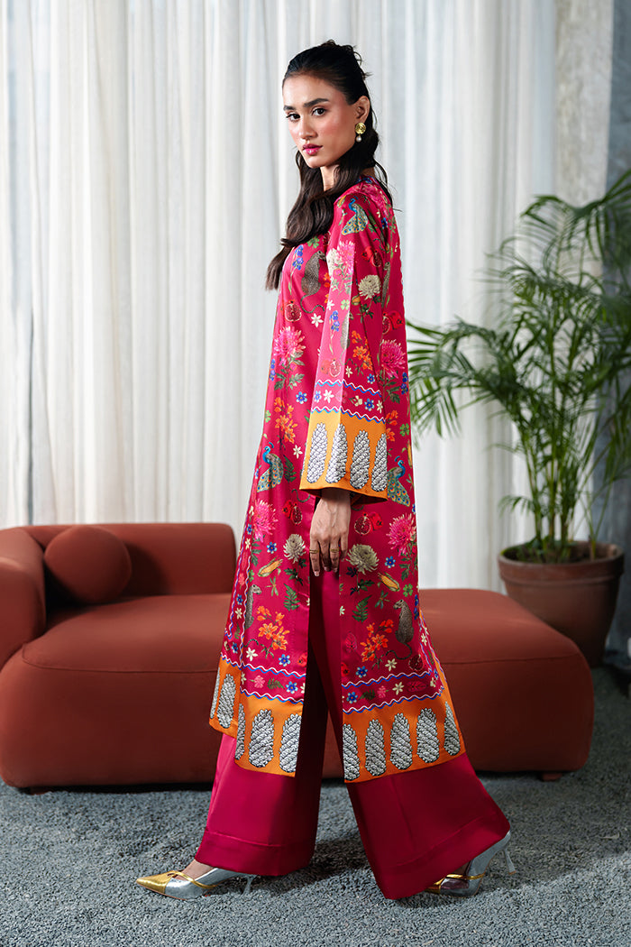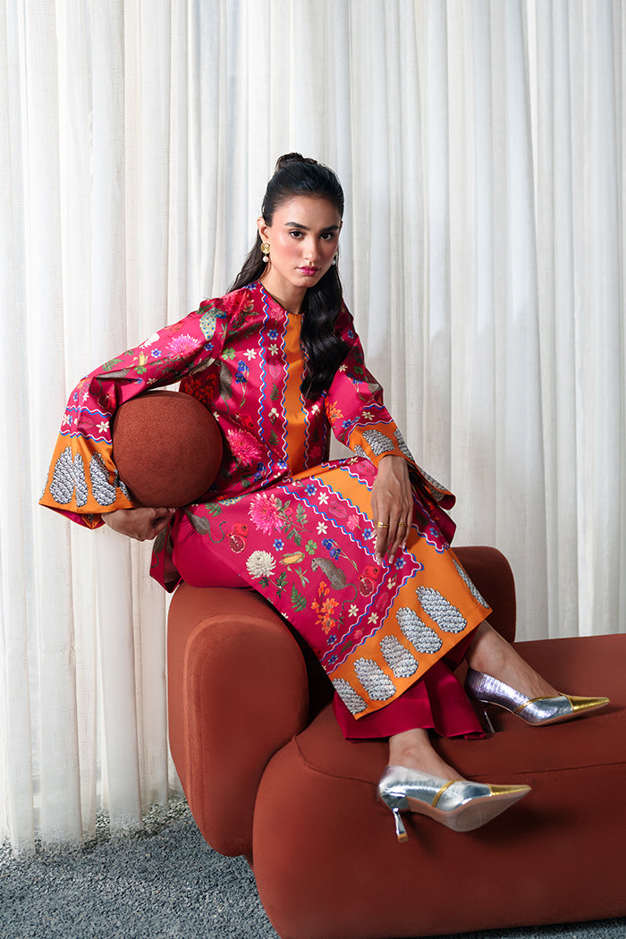 Crafted in premium charmeuse silk, this vibrant long shirt features a striking fusion of deep pink, marigold orange, and intricate multi-color motifs. The wide sleeves and structured silhouette add a modern, statement feel, while the ornate detailing gives it a rich, festive elegance. Paired with flowy matching trousers, this ensemble blends bold colour play with luxurious drape — perfect for making an artistic, confident style statement.