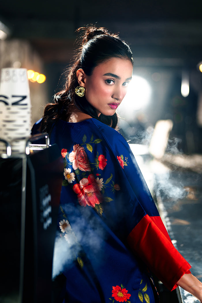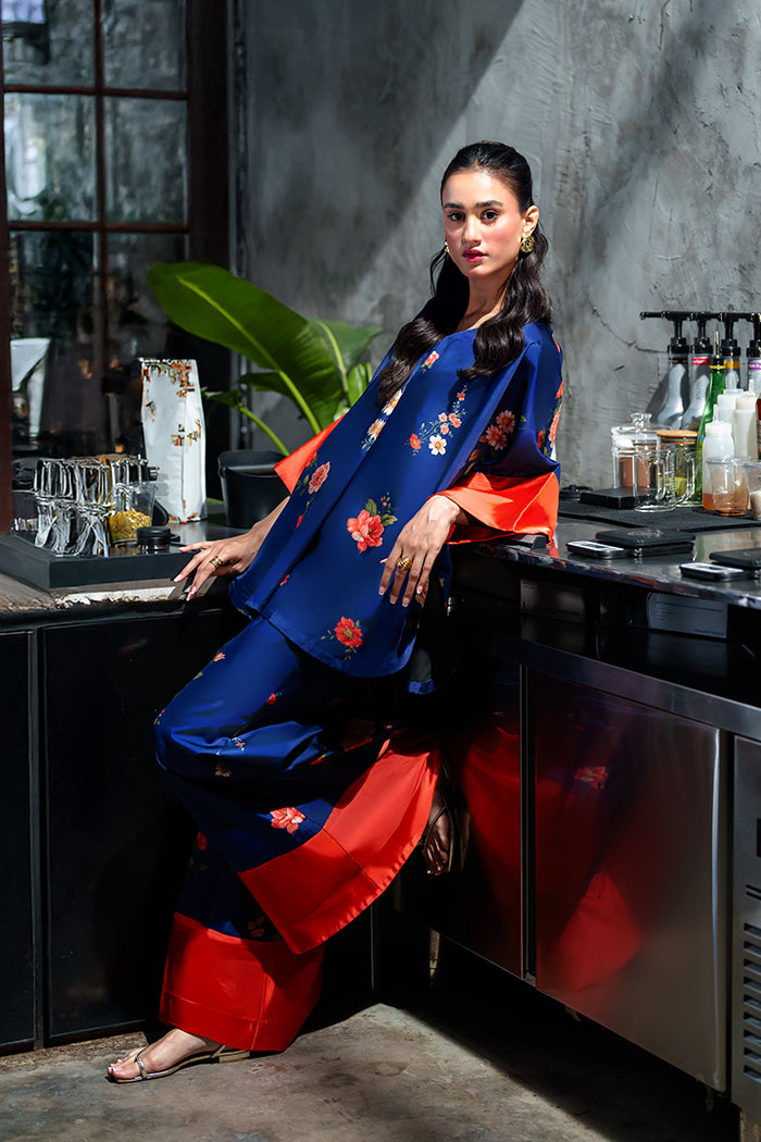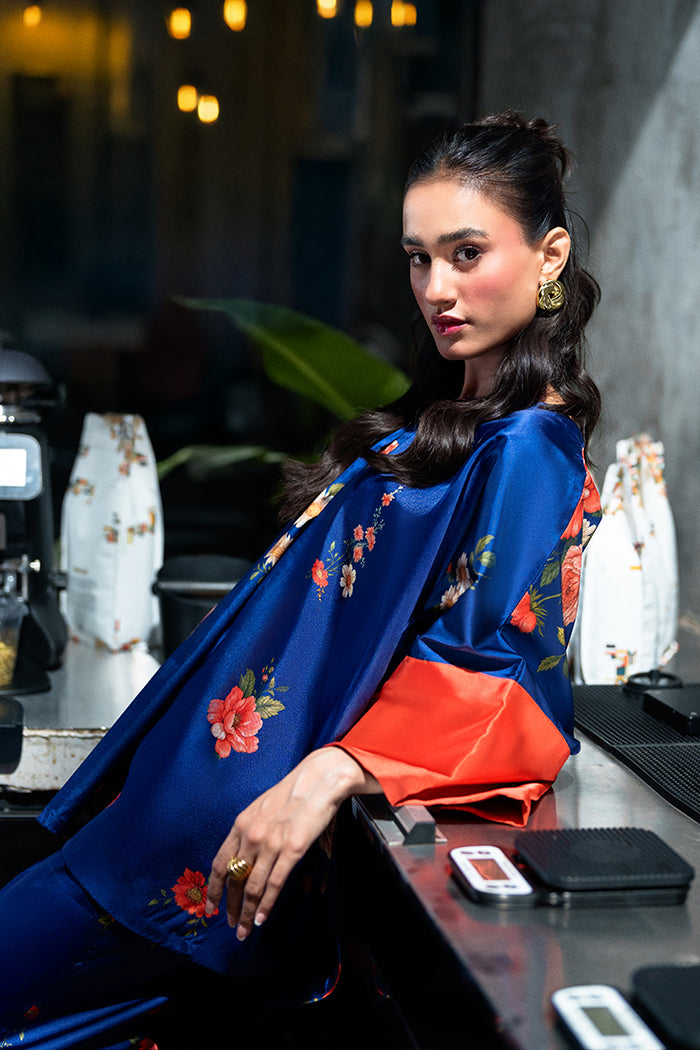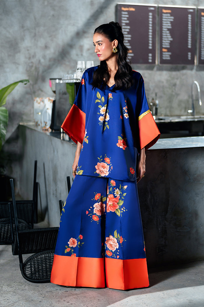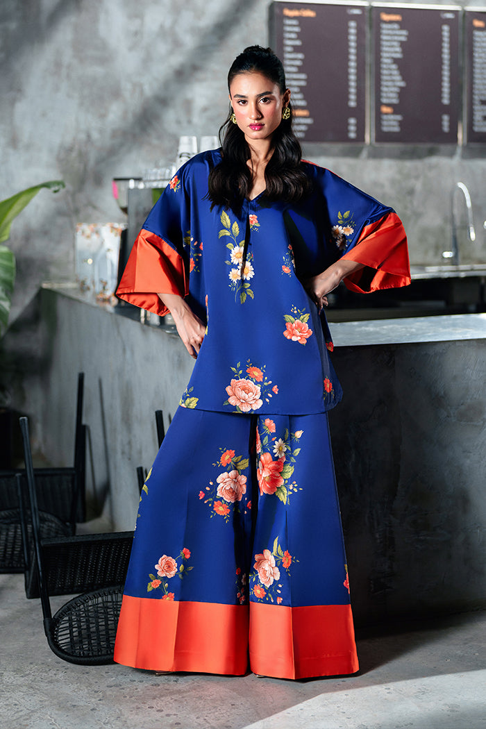 Crafted from luxurious charmeuse silk, this vibrant cobalt-blue ensemble features a striking floral print paired with bold contrasting borders. The top has a relaxed, flowy silhouette with wide statement sleeves, giving it a modern yet elegant feel. The matching wide-leg pants mirror the floral detailing, creating a perfectly coordinated, contemporary look. Soft, smooth, and gracefully draped, this outfit offers both comfort and high-end sophistication — ideal for chic daytime events or refined evening gatherings.