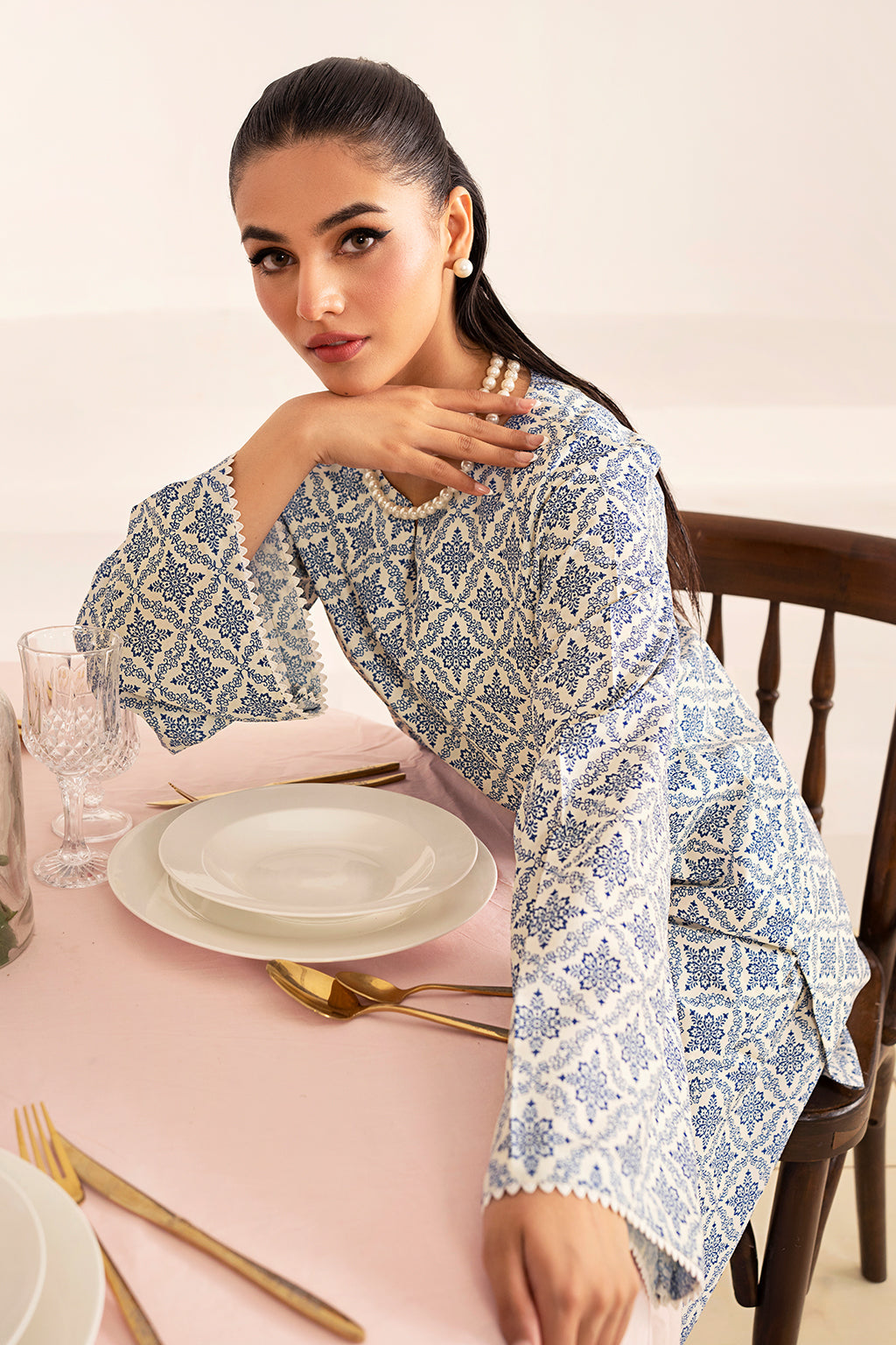 Printed shirt with lace details, paired with shalwar .